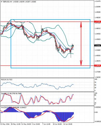GBPUSD Новостной фон: Пара, скорее всего, останется до результата референдума по членству Великобритании в ЕС в широком диапазоне. Непредсказуемость итогов этого события является сильным фактором влияния на общие настроения на мировых финансовых рынках, поэтому мы и ожидаем диапазонной торговли в парах с британской валютой. Техническая картина: Цена находится выше средней линии границ полос Боллинджера, выше ЕМА 5 и ЕМА 13. RSI находится над уровнем в 50% и движется горизонтально. Стохастики входят в зону перекупленности. MACD ниже нулевой отметки и демонстрирует рост. Индикаторы не подтверждают друг друга.