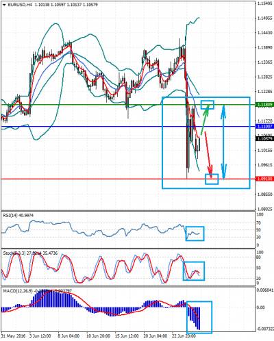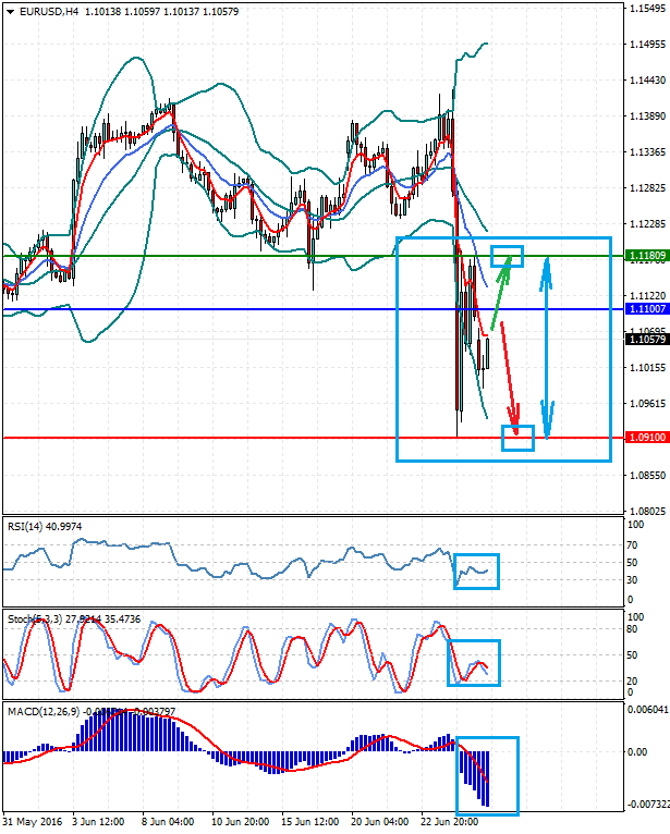 EURUSD Новостной фон: Пара делает попытку подрасти на волне некоторой стабилизации на рынке в ожидании развития событий после итогов Brexite в Великобритании. Вероятно, она будет консолидироваться поддерживаемая заявлениями ЕЦБ и ФРС о валютных интервенциях, если это понадобится. Техническая картина: Цена находится ниже нижней линии границ полос Боллинджера, ниже ЕМА 5 и ЕМА 13. RSI расположен ниже уровня в 50% и движется горизонтально. Стохастики также разворачиваются вниз. MACD ниже нулевой отметки и демонстрирует ослабление падения цены. Индикаторы не подтверждают друг друга.