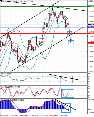 EURUSD Новостной фон: Пара снизилась к линии поддержки в ожидании выступления Дж. Йеллен симпозиума в Джексон Хоуле. Вероятность сюрприза от нее все еще в силе. А с технической точки зрения на представленном графике пара отрисовывает разворотную фигуру «двойная вершина». Техническая картина: Цена находится ниже средней линии границ полос Боллинджера, ниже ЕМА 5 и ЕМА 13. RSI расположен под уровнем в 50% и движется горизонтально. Стохастики растут. MACD движется вниз, преодолев нулевую отметку. Индикаторы не подтверждают друг друга.